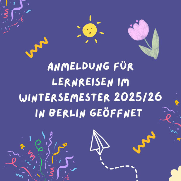 Du hast Interesse, mit der Standortkoordination Berlin, den Gruppenstarter*innen und vor allem gemeinsam mit anderen Gruppenteilnehmenden eine Lernreise vorzubereiten und umzusetzen? Unter diesem Link geht es zu weiteren Infos und der Anmeldung für Lernreisen im WiSe 25/26!